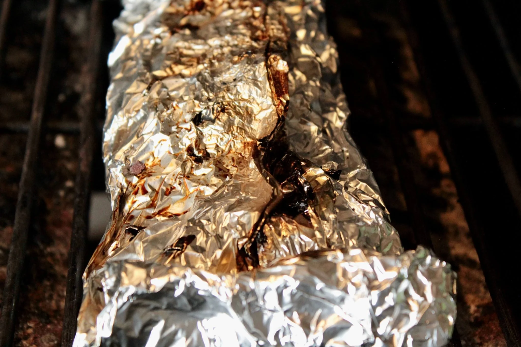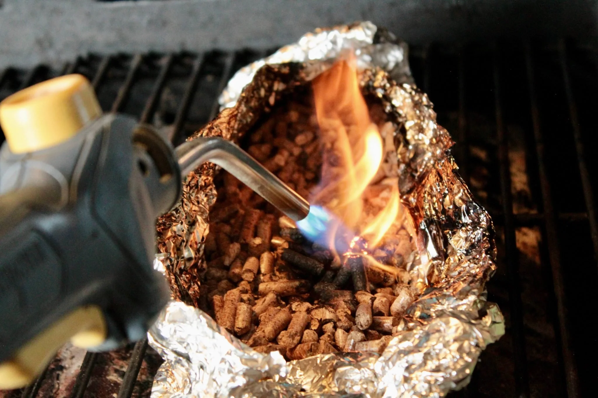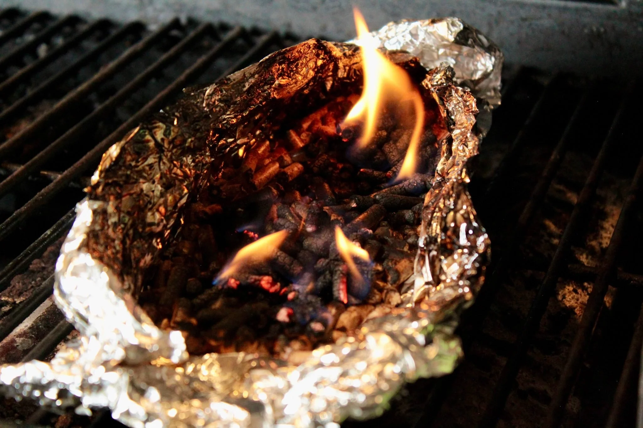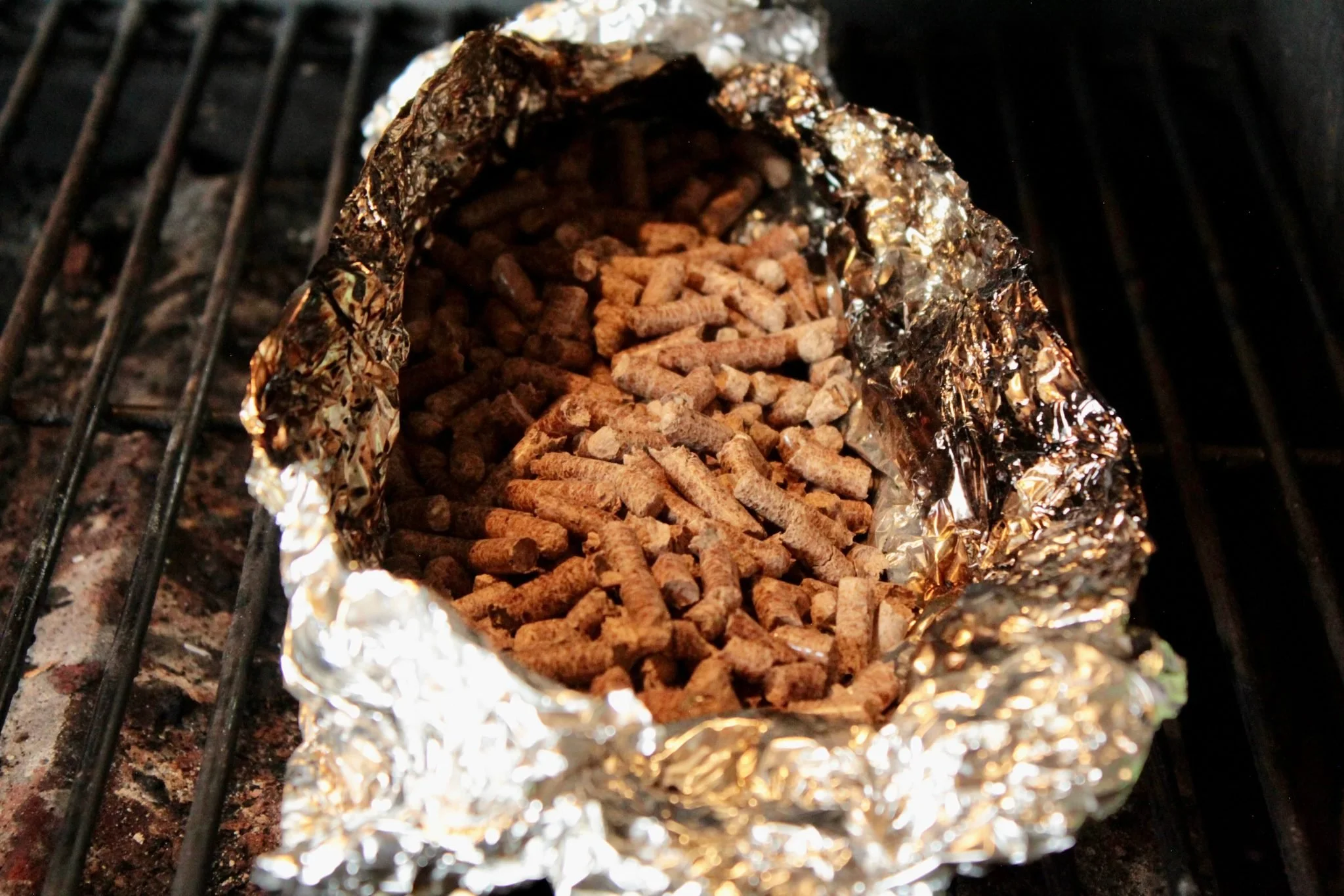 I layered two sheets of foil, added wood pellets, then rolled it up. I poked plenty of holes in it and then opened the seam back up so I could light it on fire.